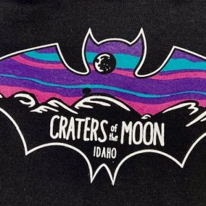 This T-shirt tells the story of the Shoshone Legend on how the Craters were formed:”…the serpent coiled around the mountain and squeezed until liquid rock flowed…” on the front. The back has a futuristic design and “Craters of the Moon National Monument and Preserve IDAHO on the back. Within the design are the words “COOL. FOR NOW.”